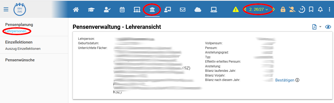 Sobald von der Administration freigeschaltet, ist deine persönliche Pensenplanung für das kommende Schuljahr unter Pensen → Lehrpersonen zu finden, wobei du rechts oben in das richtige Semester wechseln musst.