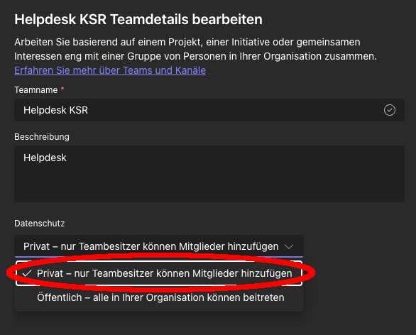 Öffentliche Teams können auch im Nachhinein auf privat umgestellt werden: