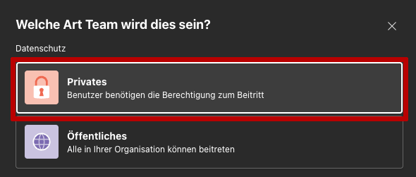 Bitte beim Erstellen von Teams stets Privates wählen - es sei denn, es sollen alle Schüler:innen und Lehrpersonen der KS Rotkreuz auch ohne Einladung Zugriff auf das Team erhalten. Auch zu einem privaten Team können externe Besucher eingeladen werden.